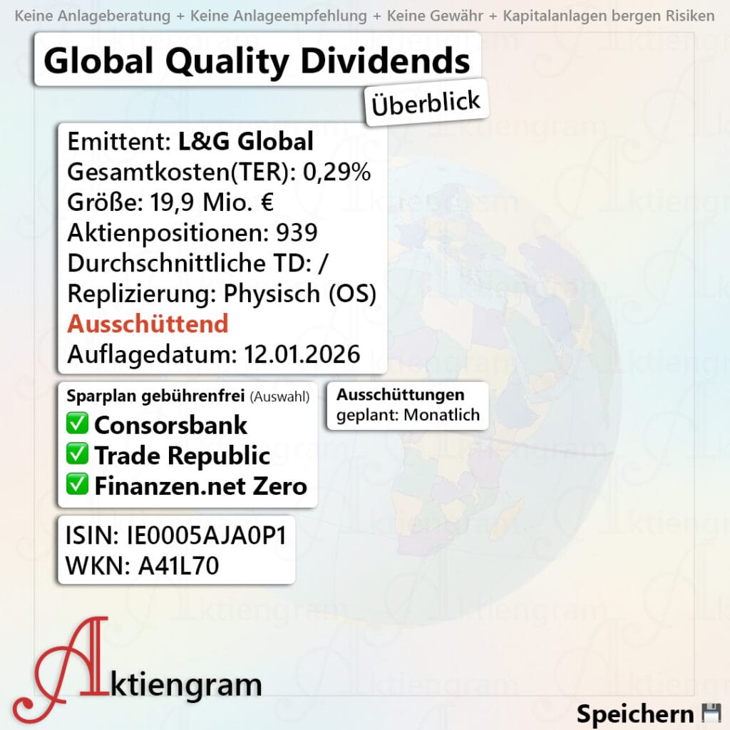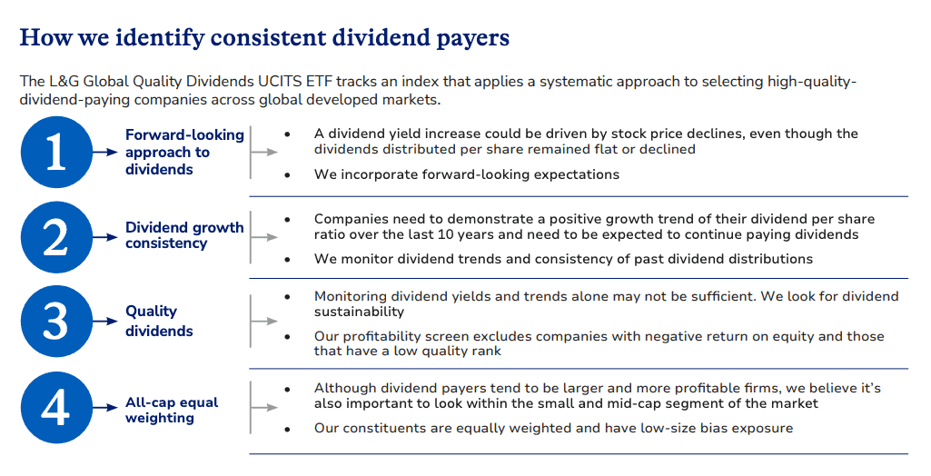 Seitens L&G heißt es: „Der L&G Global Quality Dividends ETF investiert in Unternehmen aus entwickelten Märkten weltweit, die sich durch überdurchschnittliche Dividenden- und Qualitätsmerkmale auszeichnen. Der zugrunde liegende Index enthält Unternehmen mit positivem Dividendenwachstum, höheren prognostizierten Dividendenrenditen und besseren Qualitätskennzahlen.