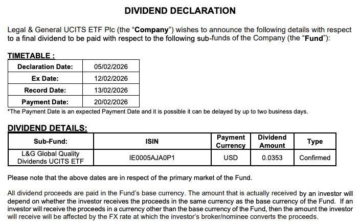 Diese Info findet man aktuell in den gängigen ETF-Portalen noch nicht, aber auf der Webseite von L&G in folgendem Dokument zur Dividendenankündigung: