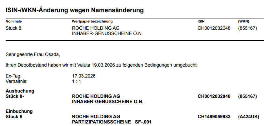 Ich hatte selbst 8 Genussscheine von Roche bei der DKB* und hier gab es folgende Info zur Umbuchung am 19.03.2026: