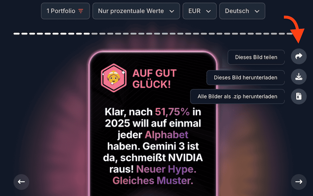 Im Web findest du oben direkt die Optionen, um deine Badges zu konfigurieren. Hier kannst du auswählen, welche Portfolios für die Badges genutzt werden sollen, ob du absolute oder prozentuale Werte sehen möchtest und welche Währung verwendet werden soll. Neu in diesem Jahr ist auch die Option, Badges auf Deutsch oder Englisch anzuzeigen.