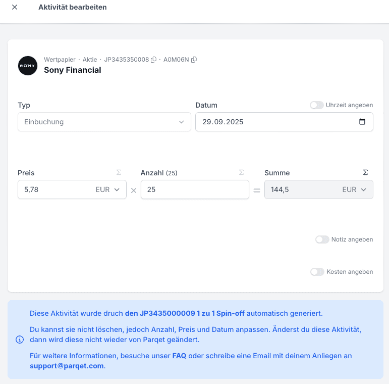 In Parqet* wird der Spin-off automatisch hinterlegt. Wenn die automatische Buchung zu den Infos deines Brokers abweicht (hier kochen oft einige Broker ihr eigenes Süppchen), kannst du sie auch manuell anpassen. Hier am Beispiel der automatischen Einbuchung: Im Depot waren vorher 25 Sony Aktien: