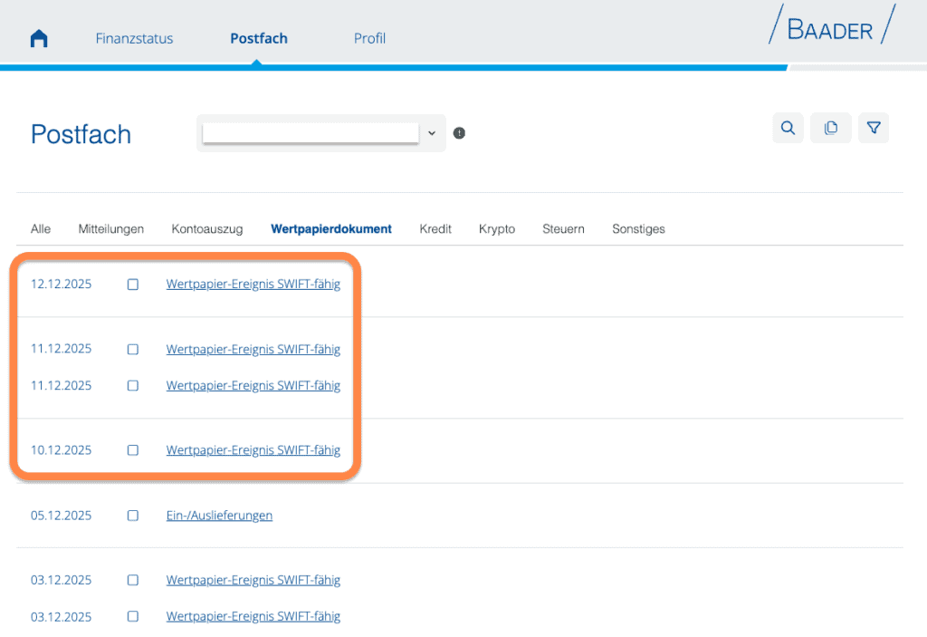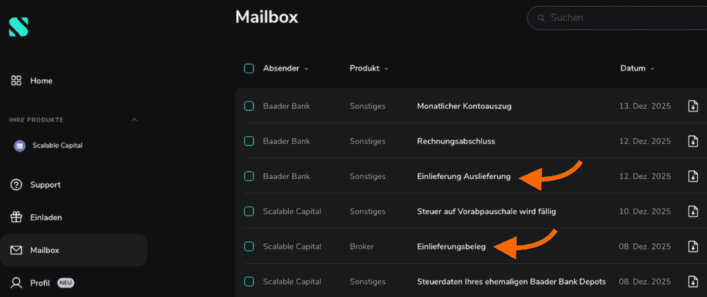 Zusätzlich findet man in der Mailbox (Postbox) nach dem Übertrag noch Dokumente zur Depoteinlieferung (Scalable) und Depotauslieferung (Baader), in denen der gesamte Übertrag nachzuvollziehen ist.