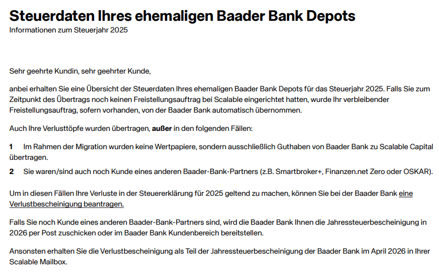 Zusätzlich hat mich überrascht, dass die Dokumente vnoch on der Baader Bank ausgestellt sind. Schaut bei euch am besten auch mal in die Mailbox – vielleicht liegen sie dort ebenfalls. Ich denke das von Scalable hier im Laufe der Woche dann die, die noch bei Baader lagen, gesammelt überwiesen werden?