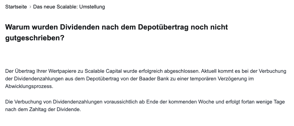 Allgemein muss man sich jetzt auch auf spätere Dividenzahlungen einstellen. Bei Baader traf die Dividende meist 2 Werktage nach dem offiziellen Ausschüttungstag ein, bei Scalable sind es 3 (also ein Tag später)