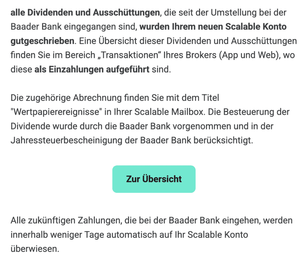 Und auch der Übertrag der Cash-Bestände vom Baader Konto zu Scalable hat bei mir reibungslos geklappt.